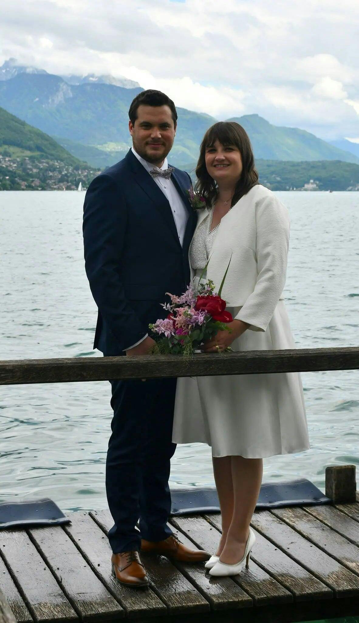 - Details: Scalloped lace sleeves, fabric-covered buttons down the back