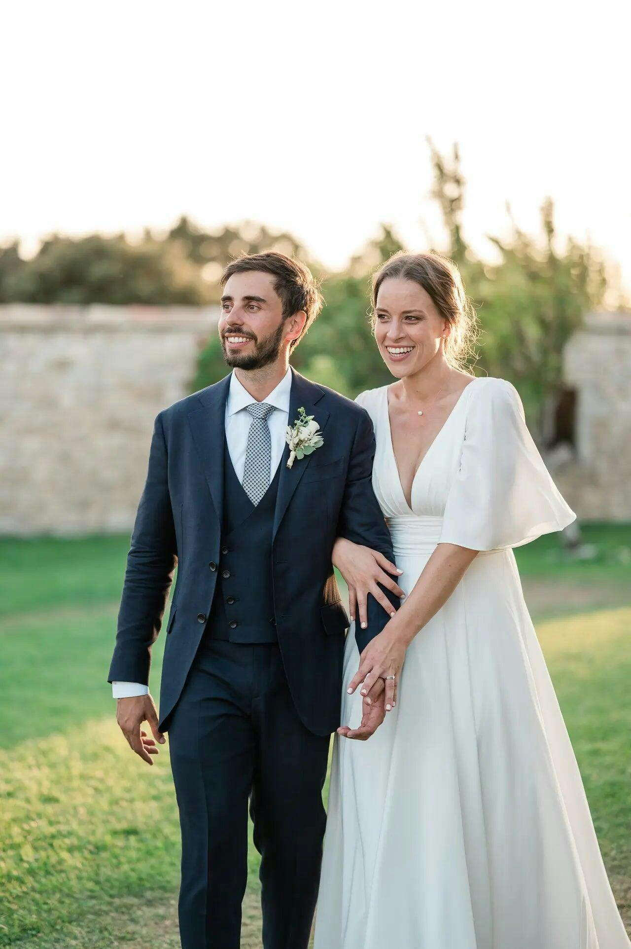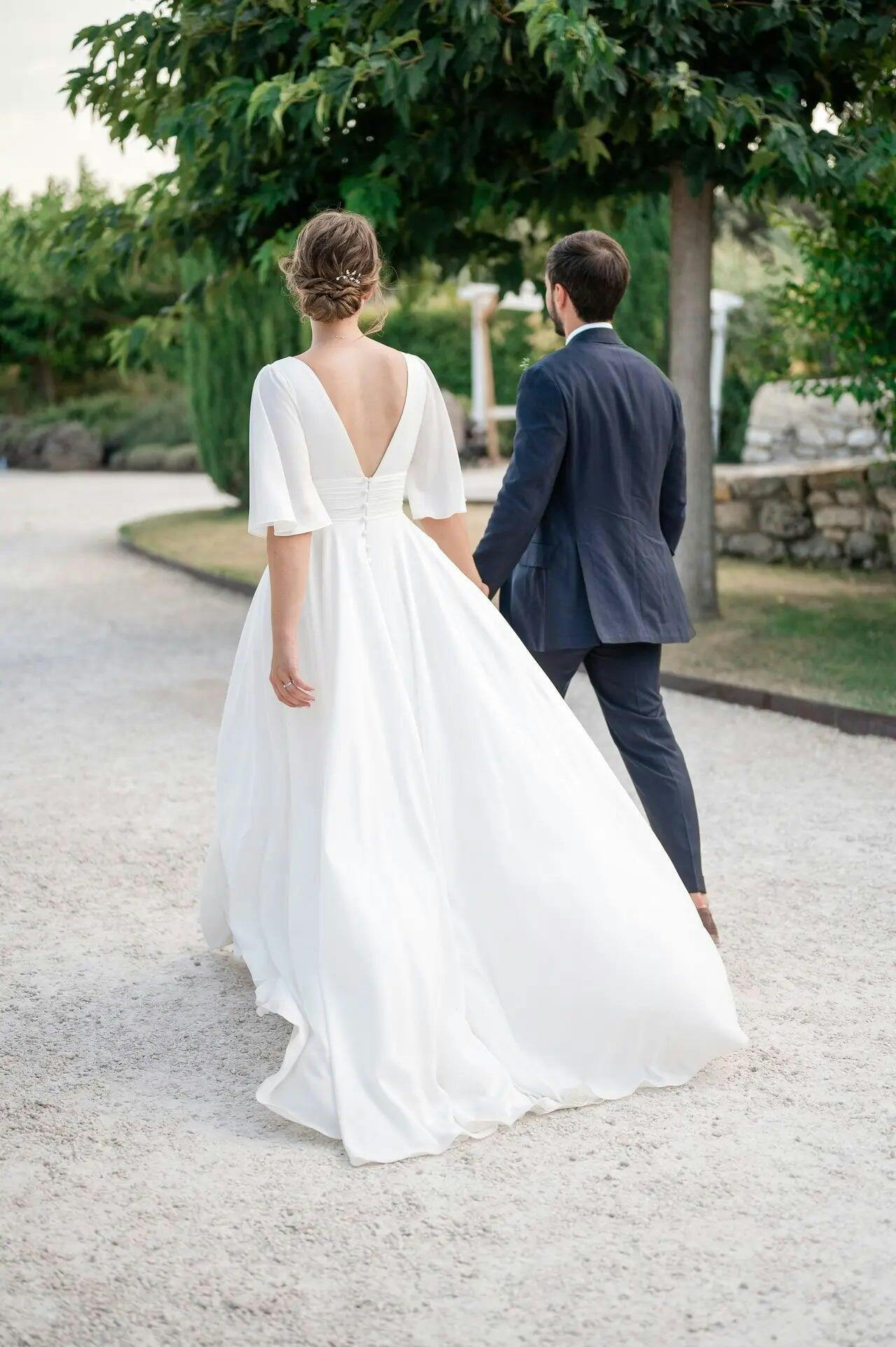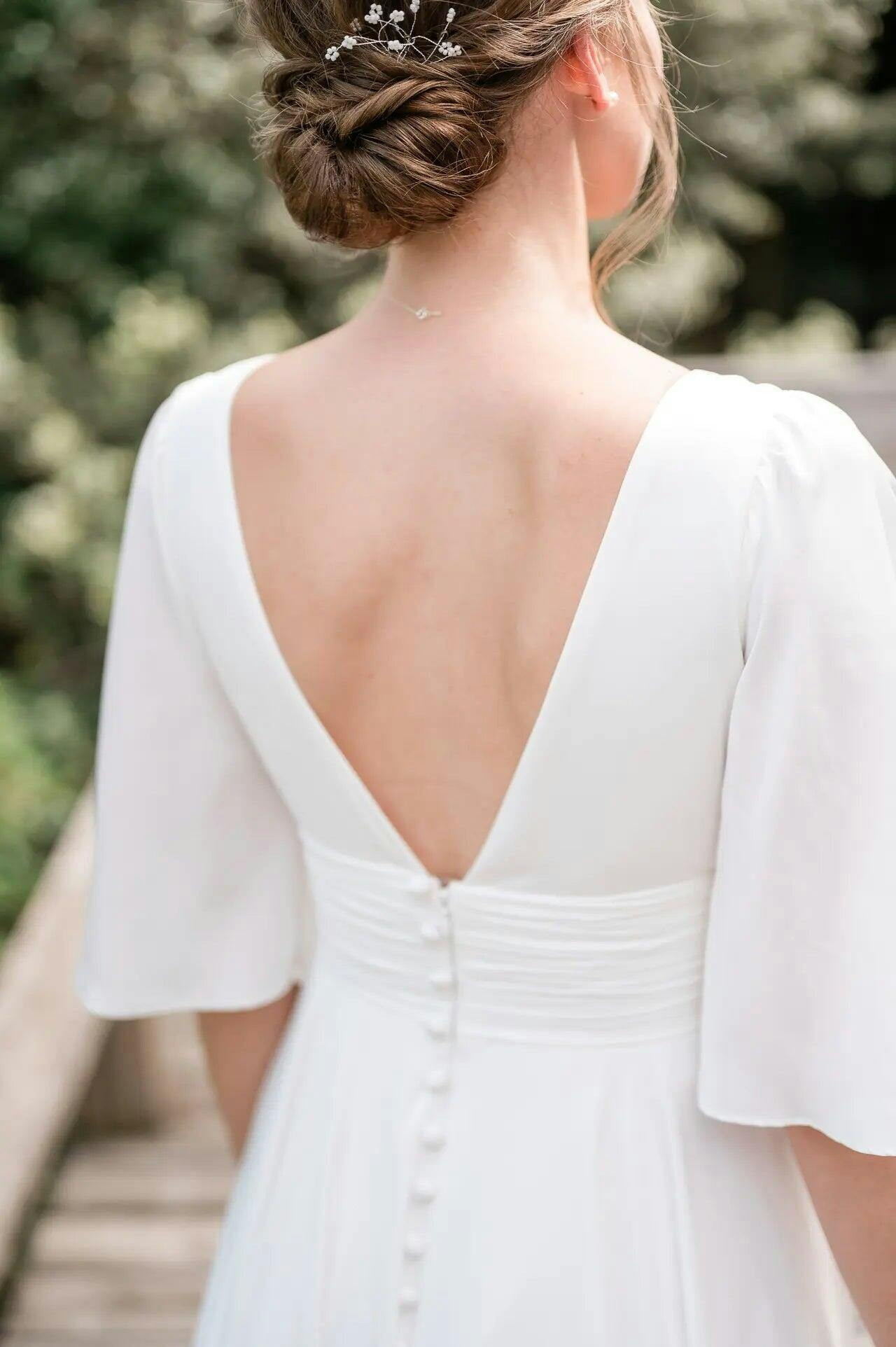 - Mid-length flutter sleeves for an elegant drape